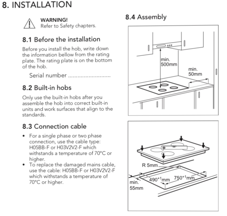 3. It is recommended that qualified electricians should be installing electrical appliances. They will typically carry cabling and will be able to assess the customers requirements on an individual basis before installation. Qualified installers will also be very aware of any changes when it comes to installation standards and official requirements when it comes to installing appliances, such as hob to hood distances or required distances surrounding the hob. Not following new guidelines may impact the warranty of the appliance and some household insurance policies.